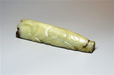 海南民间藏家宋先生收藏的汉代玉猪,长10.7cm,宽2.6cm,高2.4cm,长方柱形。玉猪玉质细密,造型为伏卧猪状,背部滚圆,周身仅用勾撤技法琢出几道宽阴线,分别表现出猪的双耳、四肢等各部位轮廓。而腹下、嘴及尾部均随形琢成平面。在这种大刀阔斧的造型艺术中,还藏有细微的精巧,即猪的下颔与尾的顶端分别饰有一个横穿圆孔。此猪形玉握造型简洁,制作工艺精致,琢磨、抛光均十分细腻,器物表面光洁明亮。用浅浮雕简单几条线,刻画出猪的腿部四肢,看起来沉稳、肥实、力道十足。整个玉猪造型布局均匀,线条简洁而流畅,刀法娴熟,琢磨极好。雕刻工艺具有典型的“汉八刀”风格,艺术感极强。