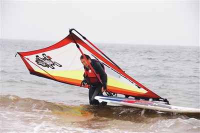 阎浩身材中等,而他使用的帆有4.5米高,板也有2.6米长。每天下午他独自一人扛着帆和板到海里练习,风雨无阻。