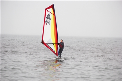 下水,扬帆,数次被风浪打倒,又数次重新站起来。记者看到,站在板上的阎浩神采奕奕,努力控制着平衡,身体随着板和浪一起摇晃摆动。他调整着帆的角度,和他的帆板一起在海上运动,仿佛踏浪的骑士一般,一路向前。