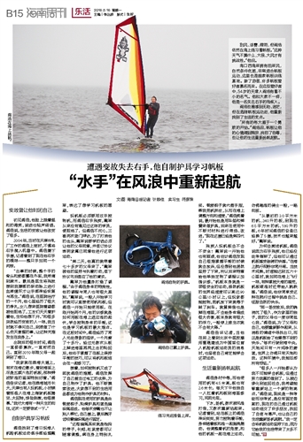 海口西海岸拥有回岸风,自然条件优越,非常适合帆板运动,这里也是国家帆板训练基地。除了游客,许多帆板爱好者慕名而来。在这些爱好者中,54岁的天津人阎浩有着不小的名气。他和大家不一样,他是一名失去右手的残疾人。