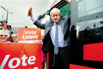 近日,在英国西南部城市特鲁罗,前伦敦市长鲍里斯·约翰逊参加支持英国离开欧盟的拉票巴士的启动仪式。 新华社发