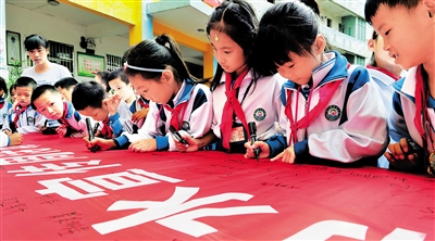 5月16日上午,由海口市水资源管理中心主办的“坚持节水优先 建设海绵城市”2016年全国城市节水宣传周活动在海口市丁村小学举行。孩子们在校园里的节约用水宣传条幅上踊跃签名,积极加入到节约用水行动中。本报记者 古月 摄