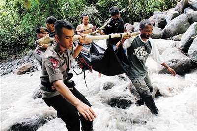 5月16日,在印度尼西亚北苏门答腊省,警察和村民抬着一具洪水遇难者的遗体。 新华社/法新