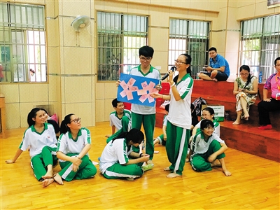 2016年5月12日,琼海嘉积中学高三(1)班在进行高考团体心理辅导课,学生们在分享小组的资源图:完美小组的资源图拼成星星图案,寓意是我们都是考场上最闪亮的星星。 李惠君 摄
