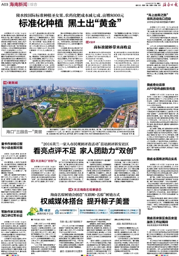 已建两年的省级陵水圣女果生产标准化示范区项目,5月5日通过省质量技术监督局组织的专家考核验收。省质监局标准化处处长戴恩桦告诉记者:“按与国际接轨的标准化规程生产管理,能提高农产品的品质和产量,降低成本,农民大幅增收。”