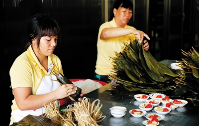 儋州禾丰五姐妹粽子有限公司的女工在生产车间绑扎粽子。舒晓 摄