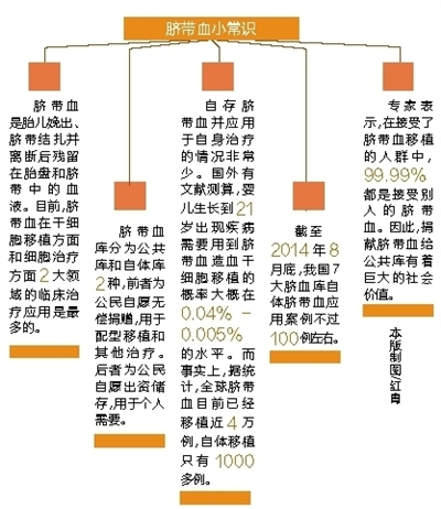 目前,在我国,自存脐带血并应用于自身的情况属于小概率事件。姚红霞提醒,自体储存的脐带血能用到的几率很小,可治疗的疾病有限,而且如果存储的脐血量很少,可能还会遇到造血干细胞不够的情况。