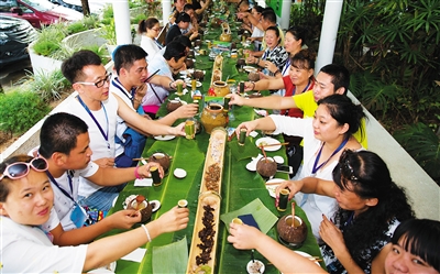 芭蕉叶当桌布,椰壳做碗,竹筒装酒、盛菜……今年5月19日,是第六个中国旅游日,五指山市通过长桌宴的形式宣传推介五指山市“十大名菜”,三亚市部分旅行社负责人、旅行社门店负责人、业务骨干和游客、市民等参加体验活动,现场品尝五指山五脚猪、小黄牛、蚂蚁鸡等美味佳肴。五脚猪肉质结实、鲜嫩爽口、味道芳香、多吃不腻;雷公根、百花菜等野菜清热解毒、清香怡人……