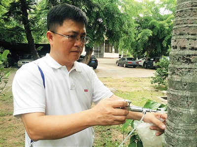 黄惜在给槟榔树“打针”。 本报记者 陈蔚林 摄
