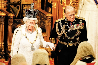5月18日,在英国伦敦,英国女王伊丽莎白二世(左)发表议会开幕讲话后与丈夫菲利普亲王离开议会开幕仪式现场。 新华社/法新