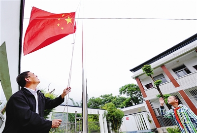 5月26日,吴志光老师和兰新荣在操场参加升国旗仪式。福建永泰县塘前乡芋坑小学只有一个学生和一个老师。学生兰新荣8岁,上2年级;老师吴志光57岁,有着35年教龄的他在这所单人校已执教7年。 吴老师说,兰新荣的父母离异,父亲在外务工,平常的生活靠年迈多病的爷爷奶奶照顾,村外的学校条件虽然好些,但离家有9公里,因为没人接送,他只能在村里的小学就读。为了这位学生,当地教育部门保留了这所学校,吴老师也为了这一位学生默默坚守。新华社记者 张国俊 摄