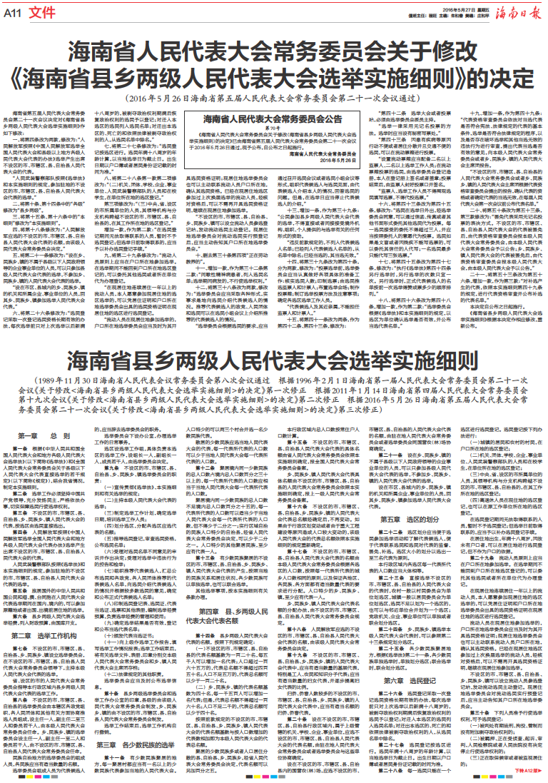 海南省人民代表大会常务委员会关于修改 《海南省县乡两级人民代表大会选举实施细则》的决定