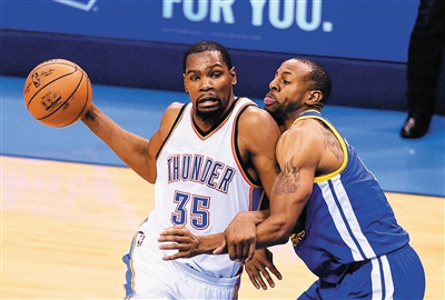 勇士队伊戈达拉(右)在比赛中防守雷霆队杜兰特。 新华社发