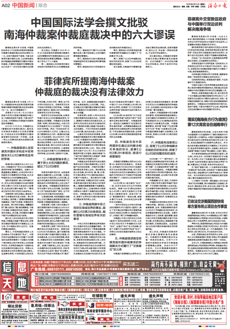 中国国际法学会撰文批驳 南海仲裁案仲裁庭裁决中的六大谬误