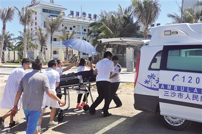 三沙海上搜救分中心工作人员和三沙市人民医院医护人员在接到病人后马上对其进行救治。 三沙市海事局提供