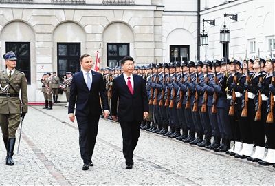 6月20日,习近平在波兰总统杜达陪同下检阅仪仗队。 新华社发