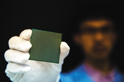 一名研发工程师展示“神威·太湖之光”所使用的“申威26010”众核处理器。该处理器采用64位自主申威指令系统,峰值性能3.168万亿次每秒,核心工作频率1.5GHz。“神威·太湖之光”里安装有40960个这样的处理器。 新华社记者 李响 摄