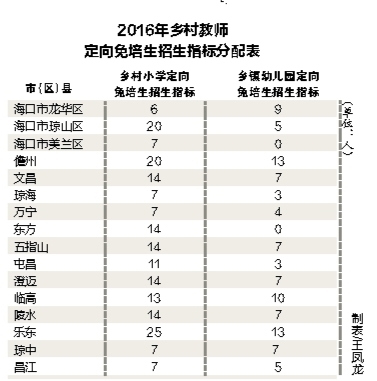 记者从《2016年乡村教师定向培养需求计划表》上看到,海口、儋州、琼海、文昌、万宁、屯昌、五指山、澄迈、临高、陵水、东方、昌江、琼中、乐东等14个市县共报了284个“免培生”需求计划。