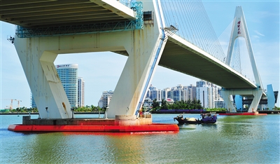 近日,在海口世纪公园休闲娱乐的市民发现,世纪大桥两个主桥墩与水面平行处,分别套上了一个桔红色的醒目的圆环。今天记者从海口市桥梁管理有限公司了解到,这是大桥防撞钢漂护弦,刚刚完成施工,防撞钢漂护弦可以防止船舶被台风吹到桥墩上,导致损毁。本报记者 古月 摄