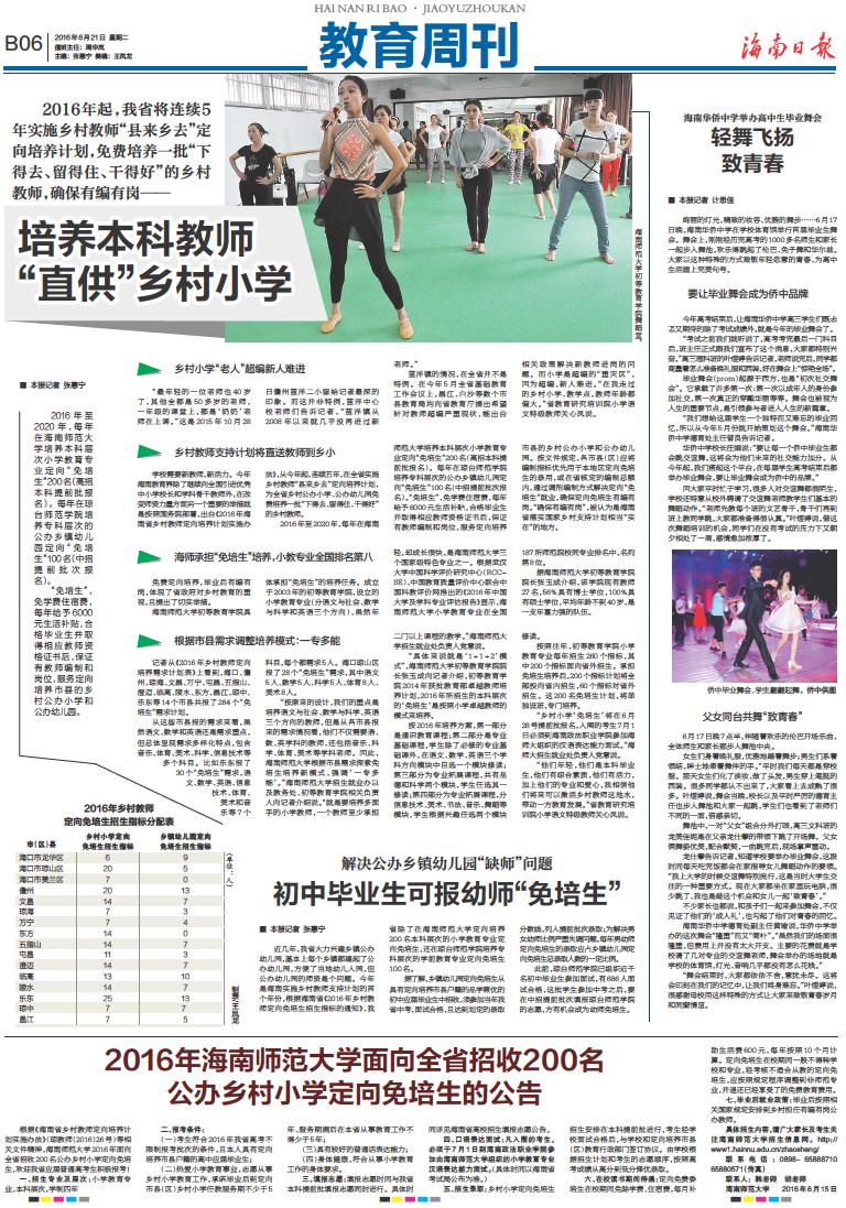 2016年海南师范大学面向全省招收200名公办乡村小学定向免培生的公告
