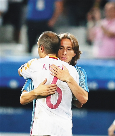 莫德里奇(右)赛后与西班牙球员伊涅斯塔拥抱致意。 新华社发