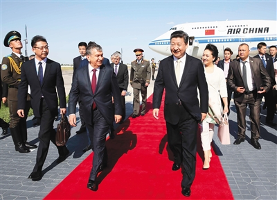 6月21日,国家主席习近平抵达布哈拉,开始对乌兹别克斯坦共和国进行国事访问并出席在塔什干举行的上海合作组织成员国元首理事会第十六次会议。这是在布哈拉国际机场,习近平和夫人彭丽媛受到乌兹别克斯坦总理米尔济约耶夫和布哈拉州州长埃萨诺夫等热情迎接。 新华社发