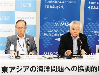 6月22日,在日本东京,中国南海研究院院长吴士存(右)出席记者会。 新华社记者 马平 摄