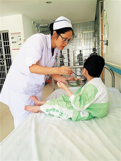 喂饭、洗澡、换尿不湿……这些在普通医院本来是患者亲属或护工干的活,平山医院的护士都要通通包办。前几年,福利院送来一个脑瘫儿童,当时只有3个月大,连牛奶都不会喝。她和护士们便轮流用胡萝卜、白米熬粥,然后通过插管的方式给小孩喂营养餐。