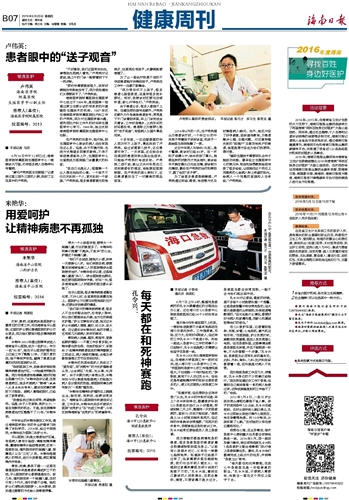 “米艳华在精神科护理岗位上兢兢业业,能吃苦,有拼劲,成绩非常突出。” 海南省平山医院院长林展告诉记者,工作多年,米艳华先后多次被评为医院“优秀护士”及“先进工作者”,今年还获得海南省“优秀护士”的荣誉称号。