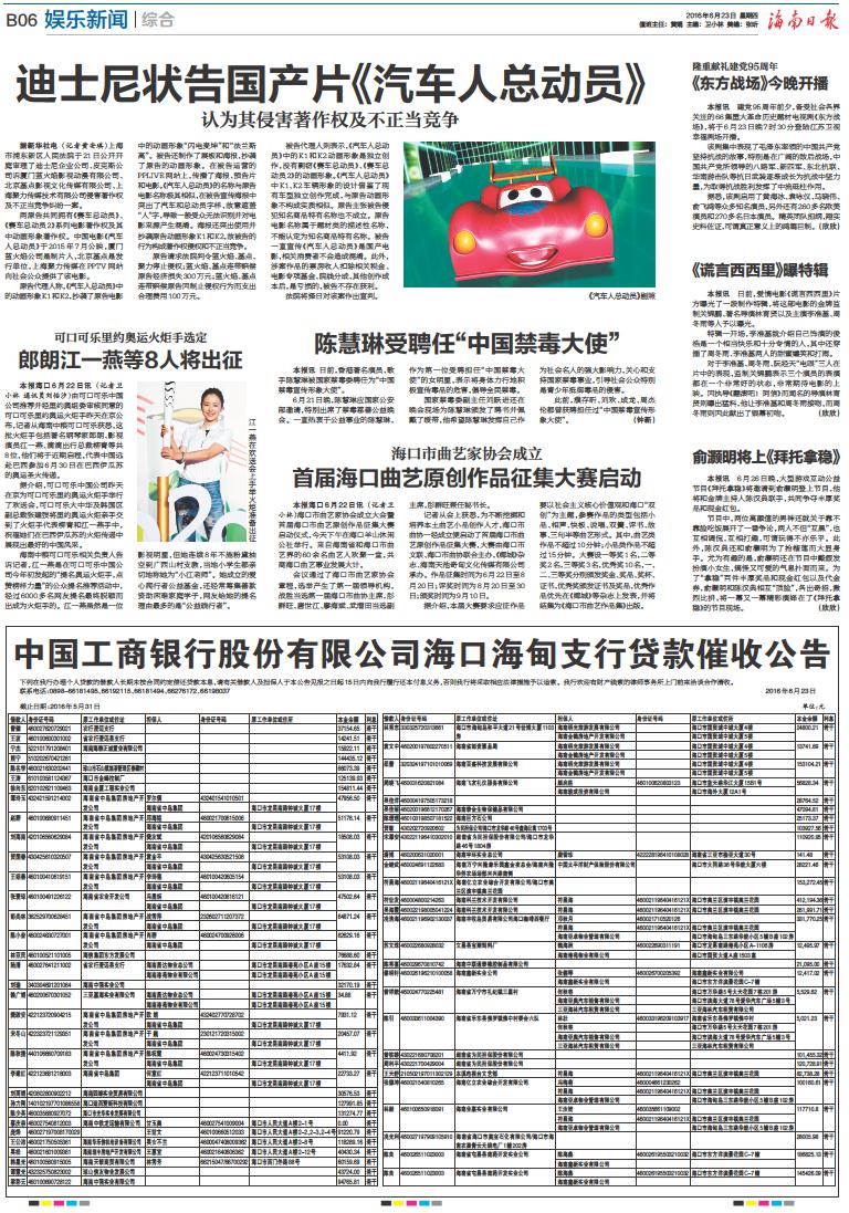中国工商银行股份有限公司海口海甸支行贷款催收公告