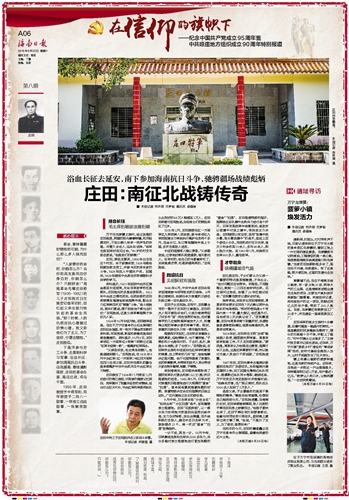 1934年10月长征开始,庄田随军征战。在位于万宁市革命烈士纪念陵园的庄田纪念馆里,有一张关于瑞金武阳桥的资料图,河面宽阔,桥面和桥墩却是临时简易搭建的。资料显示,10月8日,庄田率领红一方面军红9军第7团跨过这座“红军长征第一桥”,一路掩护红军西去。