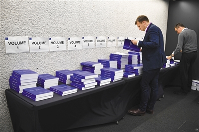 七月六日,在英国伦敦,记者翻阅英国有关介入伊拉克战争的调查报告。 新华社/路透