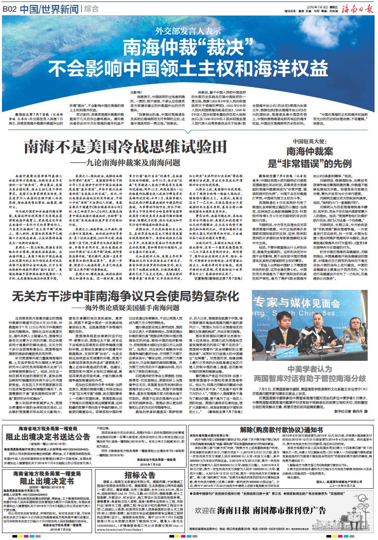 南海仲裁“裁决” 不会影响中国领土主权和海洋权益