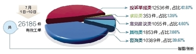 类似这样的例子还有很多。据了解,今年5月1日,省政府综合服务热线12345平台进入试运行阶段。5月1日至6月30日试运行2个月期间,共受理群众来电32205个,其中有效电话29365个,咨询类电话占八成,投诉举报类占比不到二成。7月1日,省政府综合服务热线12345平台正式运行。正式运行后投诉举报类来电显著提升,从7月1日-10日,投诉举报类共12536件,所占比重近50%。