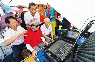 7月24日,海南日报记者也见证了科研人员的探查过程,下午4时,一部外壳黄色、电脑机箱大小的水下机器人被工作人员从平台投放至蓝洞。水下机器人通过一根长长的光纤数据线,实时向漂浮平台上的电脑回传探测数据和图像。