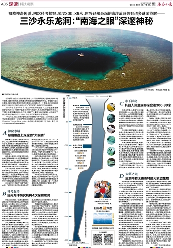 2015年8月至今年6月,在三沙市政府的支持下,三沙航迹珊瑚礁保护研究所(以下简称“航迹研究所”)科研人员采用科学器材探测与人工潜水观察测量相结合的方法,获取了大量原始科学数据,成功探明了西沙蓝洞的深度为300.89米,为世界已知最深的海洋蓝洞。