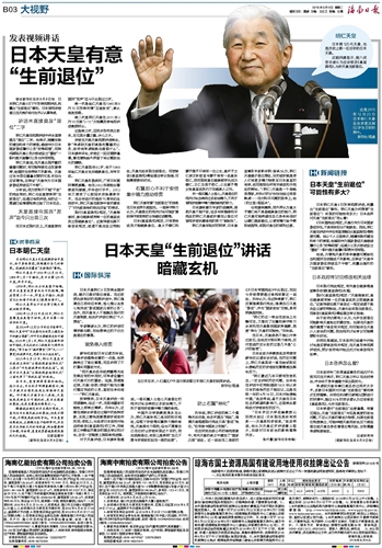 日本天皇明仁8日发表全国讲话,暗示已做好退位准备。在这段预先录制好的视频讲话中,明仁强调自己因年迈体衰,担心难以全身心地完成“象征国家元首的公务”。此外,因天皇本人不能触及现行的天皇制度,他此次讲话仅表达“个人想法”。