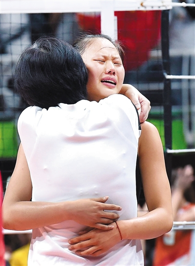 郎平(前)与球员龚翔宇拥抱庆祝胜利。