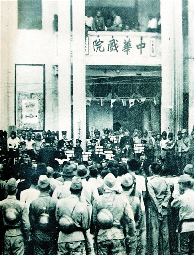 《画报跃进之日本》杂志刊登日本军队侵占海南时在海口中华戏院表演的图片。 海南日报记者 李英挺 翻拍