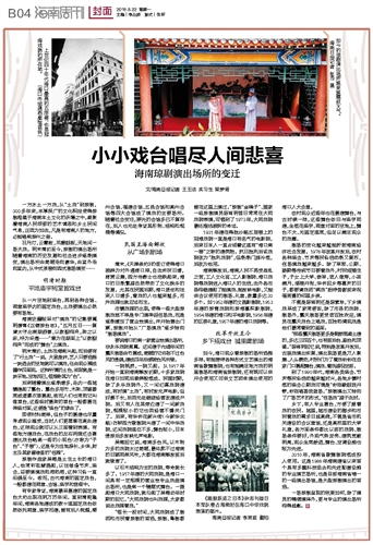 吴梅回忆说,海南多台风,以木制为多的戏院太过简陋,最终熬不过海南的日晒雨淋风吹,大都在海南解放前后就毁废了。
