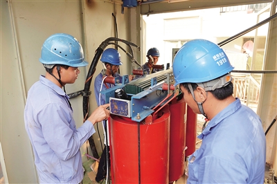 8月22日,临高县城民生花园小区,威特电气的工作人员正在加紧维修变电设备,争分夺秒供电入户。本报记者 王凯 摄