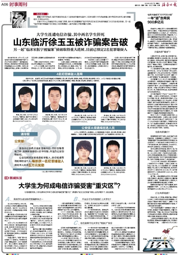 在今年大学新生入学之际,山东地区大学新生遭遇电信诈骗并非孤例。临沂另一位女学生与徐玉玉同一天被骗走准备交学费的6800元。