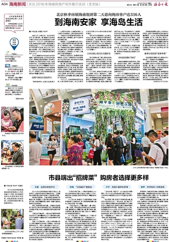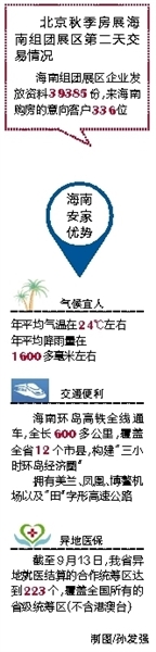 ■ 本报记者 易建阳 李关平金秋九月,天高云淡。在这收获的时节,有“楼市第一展”美誉的北京房地产展示交易会正在北京展览馆如火如荼地进行中。今天上午,记者在展馆走访发现,海南组团展区是整个展览馆最为热闹的区域之一。不少北京市民围坐在房产项目展示区咨询,房企工作人员忙着为其讲解。当日,海南组团展区企业发放资料39385份,来海南购房的意向客户336位。