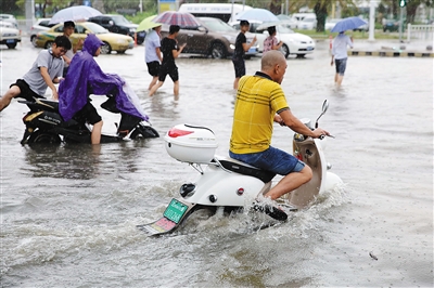 昔 昔日三亚市下洋田路口每逢暴雨就积水,市民骑电动车涉水而过。海南日报记者 武威 摄
