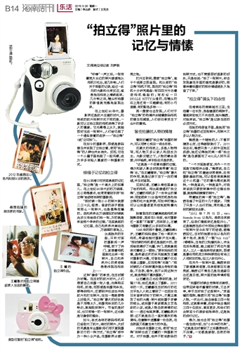 文\海南日报记者 刘梦晓“咔嚓”一声之后,一张有着宽大白边的照片缓缓地从相机口吐出,前几秒钟,人们关于图像的记录,经过一系列的光影和化学反应,逐渐地在相纸上清晰起来。几分钟之后,镜头所拍摄的影像就完整地呈现出来。