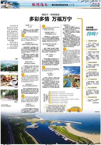 今年国庆节期间怎么过呢?不妨到万宁寻幽探秘,邂逅浪漫。国庆节期间,万宁推出10大旅游产品和7条旅游线路,让游客体验不一样的海南。 世界长寿之乡,世界冲浪胜地——万宁向您发出了诚挚的邀请!海南第一山——