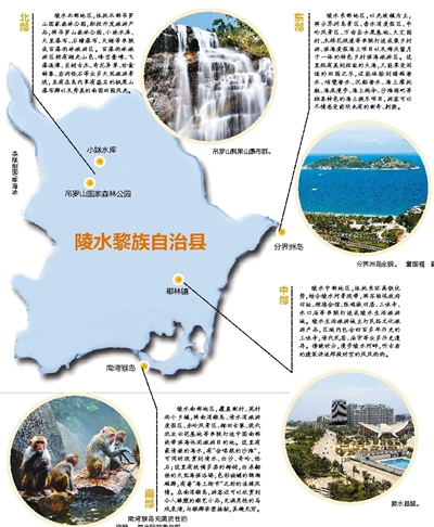 陵水南部地区,覆盖新村、英村两个乡镇,将南湾猴岛、清水湾旅游度假区、赤岭风景区、椰田古寨、现代农业示范基地等串联打造中国南部热带滨海休闲旅游目的地。这里有最清澈的海水,有“会唱歌的沙滩”,可同时观赏到清水、白沙、奇岭、怪石;这里有妩媚多姿的椰树,白浪翻扬的天然海滨浴场,色彩斑斓的珊瑚礁群,有着“海上街市”之称的渔排风情。在南湾猴岛,游客还可以欣赏到令人捧腹的猴艺小品,充满灵性的马戏表演,与猴群亲密接触,其趣无穷。