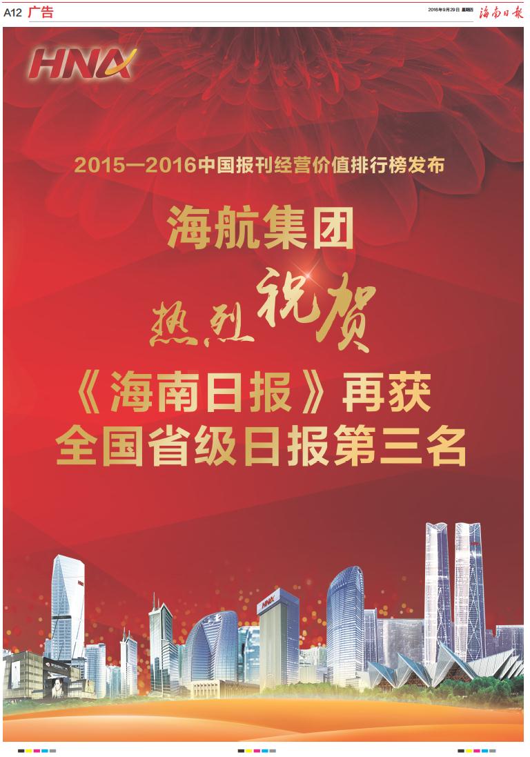 海航集团热烈祝贺 《海南日报》再获全国省级日报第三名