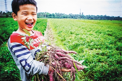 海口市美兰区三江镇,一位小游客抱着自己挖出的地瓜,十分开心。 袁琛 摄