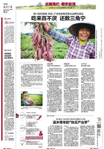10月,金秋时节,明媚阳光照耀下的海口市美兰区演丰镇一派繁忙。塘内村的田间地头,三五成群的农民正忙着施肥、浇水。村民王咸州全家齐上阵,挽着裤管,弯着腰逐个给新栽的地瓜苗浇水。“以前种地瓜就怕销路不好,现在不一样了,今年我与合作社签了订单,我们只管把地瓜种好,销售由合作社负责。”王咸州信心满满,“跟着他们种,有钱赚!”王咸州的信心来源于美兰三角宁地瓜这个品牌。近两年来,海口加快了推动农业发展标准化、规模化、产业化、品牌化的步伐。美兰区依托本地的富硒、富锗资源,从品种、供销、推介等各环节推进三角宁地瓜的品牌化建设,激发了地瓜产业活力,带动了农民增收。